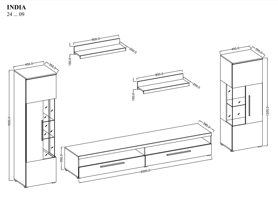 - Komplekti kuulub: 2 vitriini, 2 seinariiulit, tv-alus