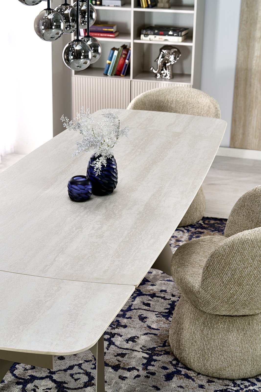 размеры: 180-260/90/76 см, удлинительный столик, материал: спеченный камень/сталь с порошковым покрытием, цвет: столешница – травертин, ножки – кашемир
